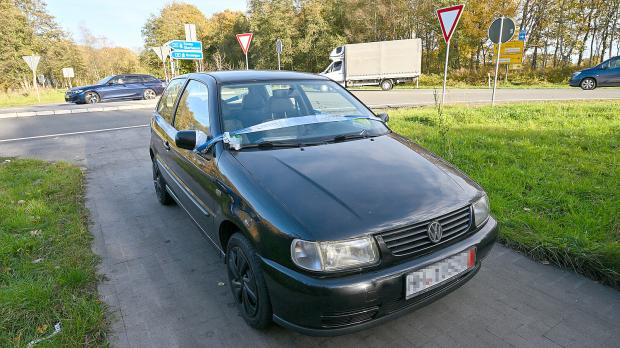Auto mit Flatterband steht an der Autobahn 28