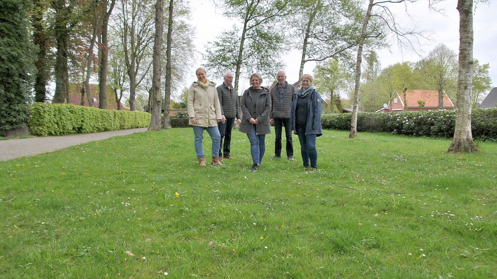 Hedda von Aswege, Detlev Schoone, Andrea Henkelmann Ernst Hennen und Martina Schneider stehen auf dem wahrscheinlich zukünftigen Dorfplatz Mittegroßefehns. Foto: Schönig