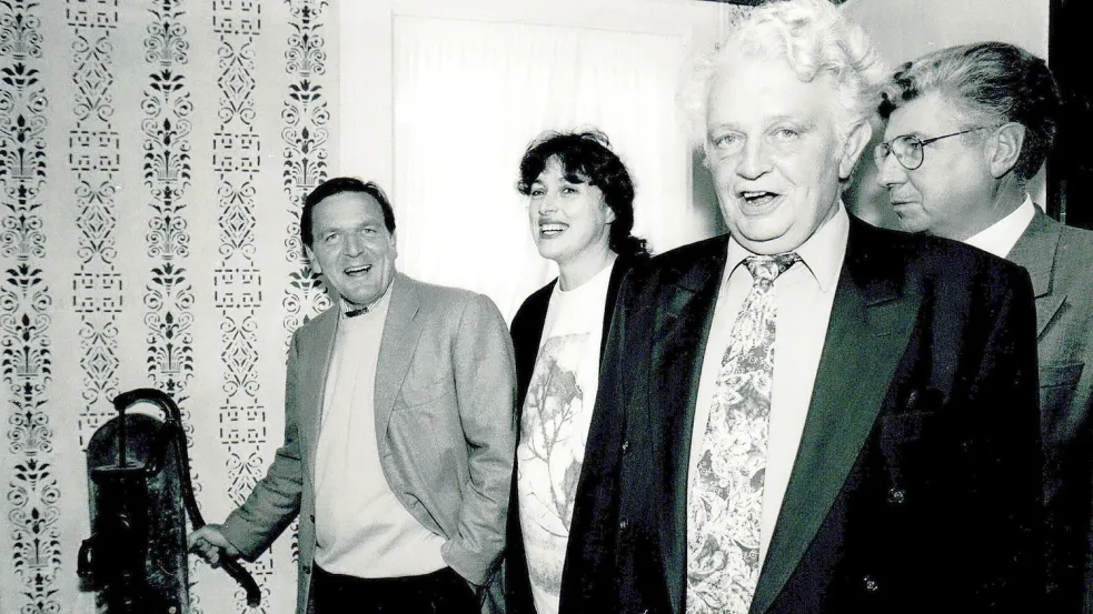 Hinrich Swieter (vorne) aus Norden war Finanzminister in der rot-grünen Landesregierung, mit Gerhard Schröder (links) als Ministerpräsident und Monika Griefahn als Umweltministerin, die hier mit dem damaligen Ihlower Gemeindedirektor Peter Tammen (rechts) zu sehen sind. Foto: Ortgies/Archiv