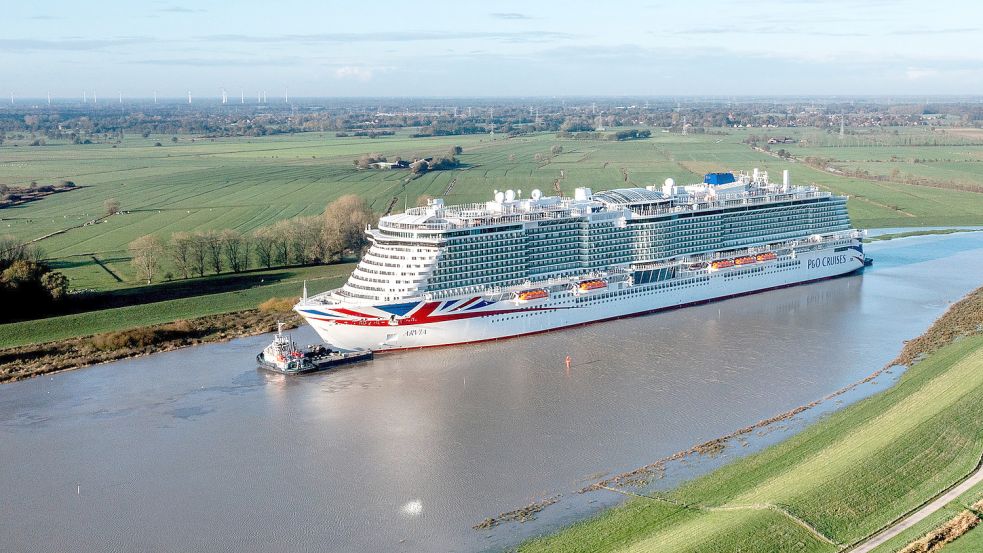 Anfang November wurde die „Arvia“ von Papenburg über die Ems bis nach Eemshaven überführt. An Bord des Schiffs ist Platz für rund 5200 Passagiere. Foto: Dittrich/DPA