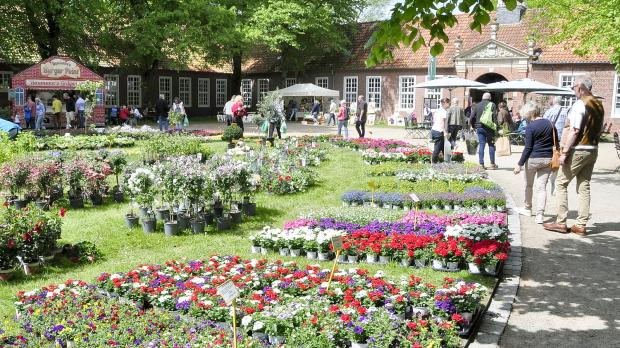 Blumen unter Bäumen: An der Evenburg in Leer gibt es an diesem Wochenende einen Frühlingsmarkt.