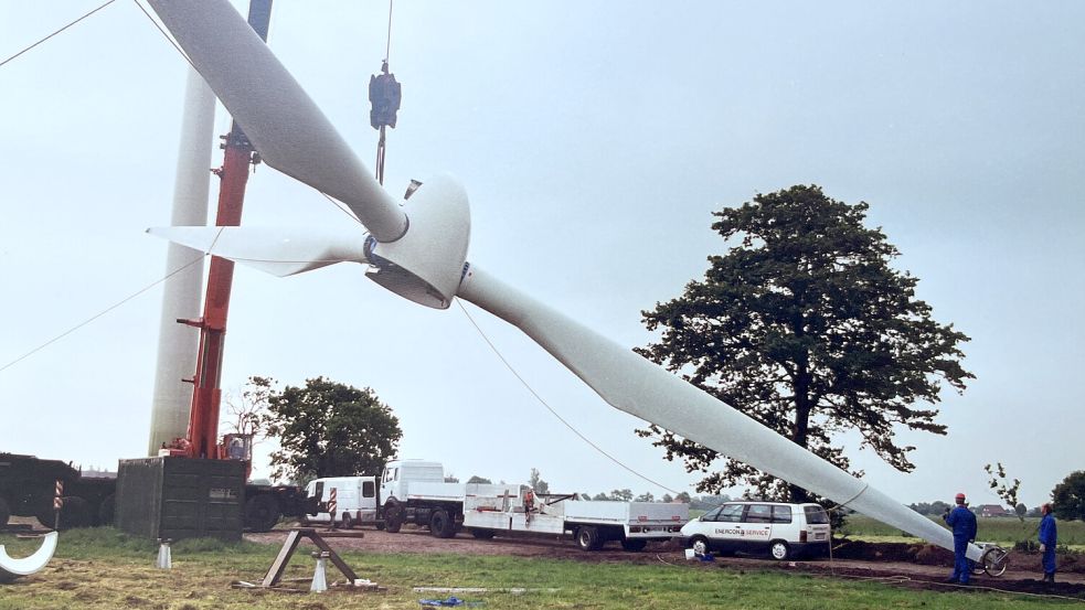 Anfang der 90er Jahre nahm das Geschäft für Enercon Fahrt auf. Mit dafür verantwortlich war auch das Modell E-30. Das Foto zeigt Arbeiten an einem Prototypen im Jahr 1994. Foto: Enercon