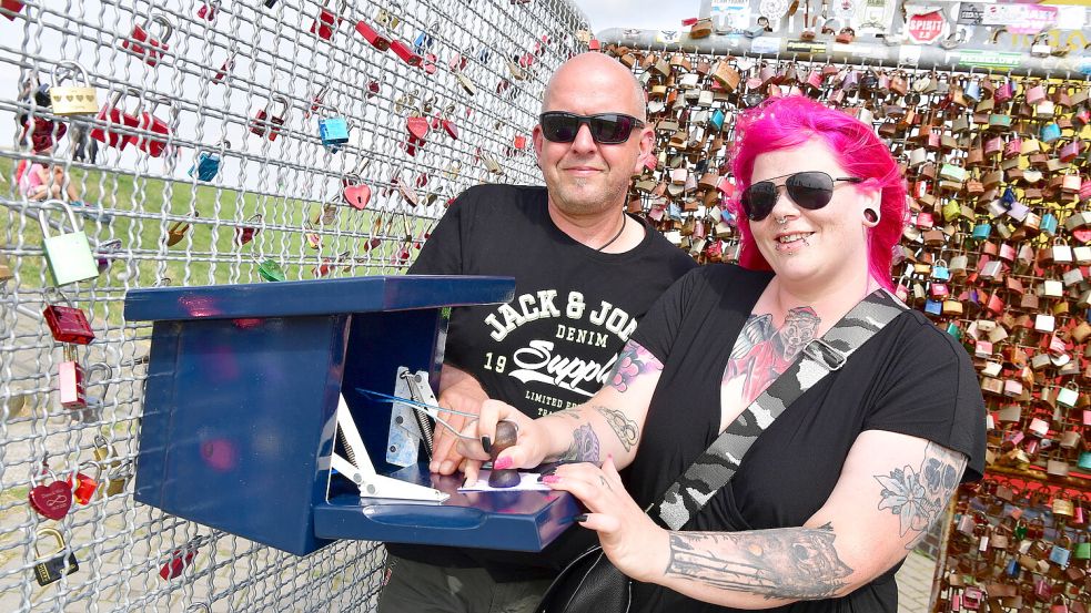 Dirk Borstell und Eileen Baumgarten aus Stralsund stempeln den Leuchtturm auf ihren Kassenbon aus dem Otto Huus. Fotos: Wagenaar
